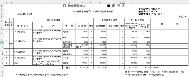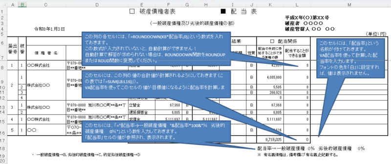 - 各債権者行の「配当することができる金額」列に「配当の手続に参加することができる債権の額」と「配当率」から金額を求める数式を入力してください。