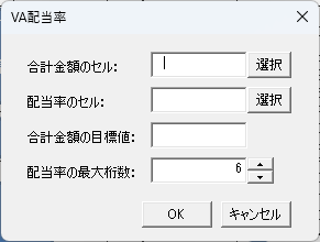 「合計金額のセル」と「配当率のセル」は、選択ボタンをクリックして、それぞれのセルの行列番号を入力してください。