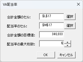 「合計金額の目標値」を入力し、「OK」ボタンをクリックすると「配当率のセル」に自動計算した配当率が入力されます。