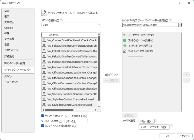 クイックアクセスツールバーでのマクロ名が区別しにくい