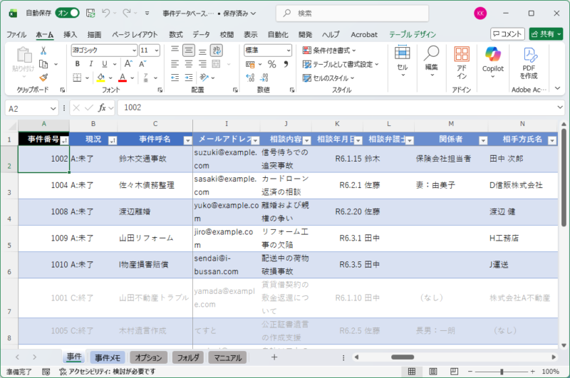• 事件データベース 事件の進捗管理とデータアクセスに特化した管理ツール。「受任」「終了」などの現況に合わせて行の色が自動で変化し、ステータスを一目で把握できます。事件に関連するデータフォルダやTeams会議へも、セルをダブルクリックするだけで瞬時にアクセス可能です。
