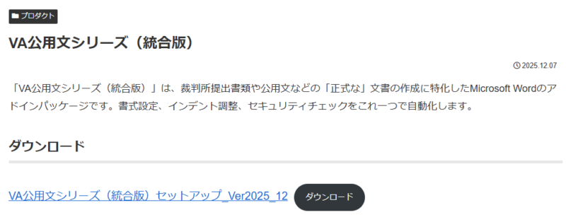まず最初に、「VA公用文シリーズ(統合版)」のウェブページを開いて、セットアップファイルをダウンロードします。←New